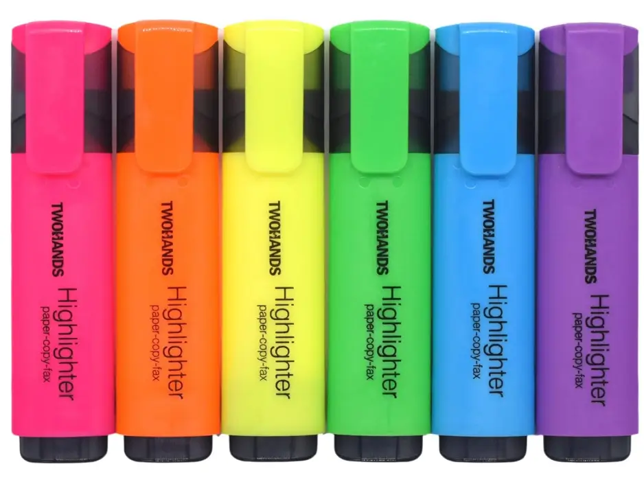 TWOHANDS Assorted Color Highlighters pack of 30 is ideal for classrooms, offices, and group study, offering plenty of markers for everyday use. The durable chisel tips allow both broad highlighting and precise underlining, while quick-drying ink helps prevent smudging on notes and documents. Smooth, reliable ink flow highlights text clearly without excessive bleed-through, making them practical for high-volume highlighting